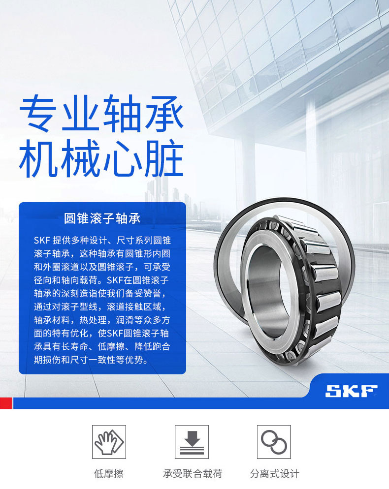 SKF圆锥滚子轴承,可以分离,由内圈与滚子、保持架一起组成的组件和外圈可以分别安装。